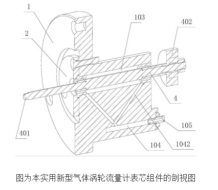 本发明有益效果在于本实用新型气体涡轮流量计表芯组件,结构简单紧凑,组装方便快捷,制造成本低,且运行精度和灵敏度高;使用寿命长。